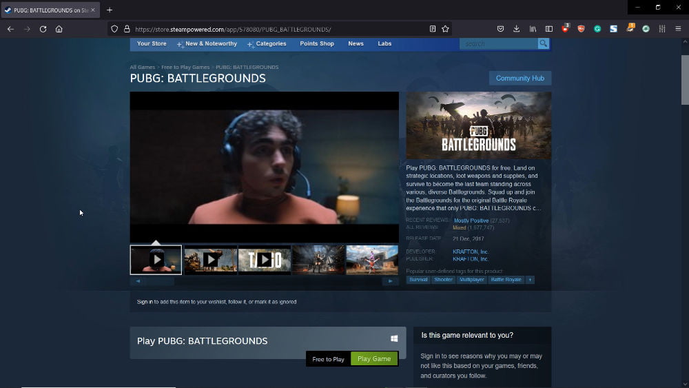 2Once you are in, scroll down and click the “Play Game” green button on the right side of the “Free to Play” tag. You can watch the presentation videos and see the pictures to get an idea of the game before downloading it. Anyway, remember PUBG is now free.