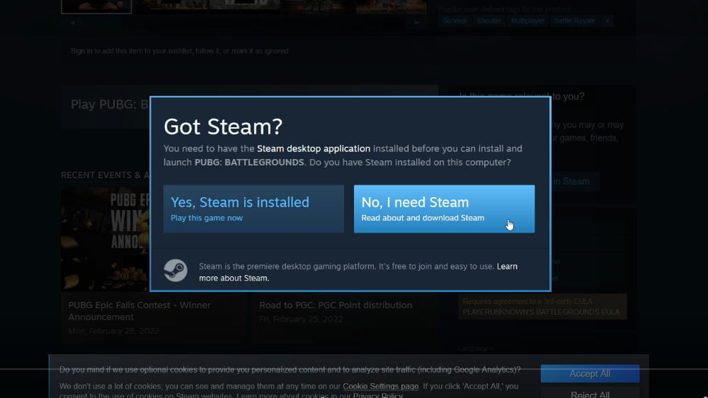 3To install and launch “PUBG: BATTLEGROUNDS”, you need the Steam desktop application first. If you don’t have it yet, click “No, I need Steam”. Then, register a free account and download the Steam client on your computer. After that, visit the Steam website once again to start your installation.